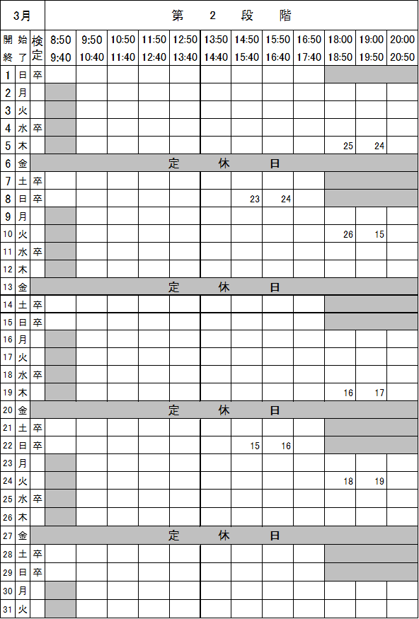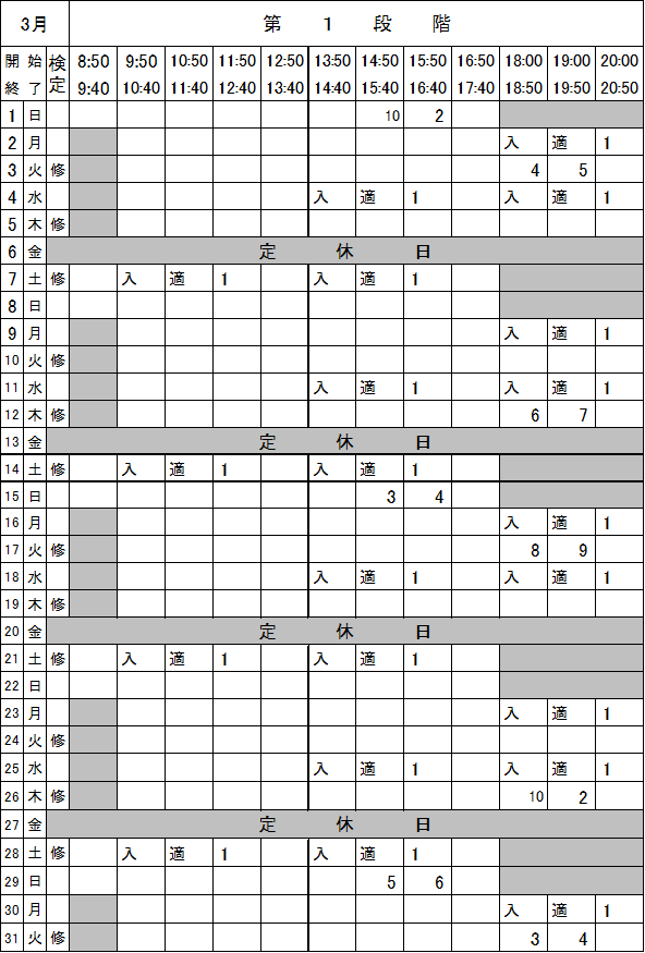 教程番号11・12・13・14は日程表には記載されていません。教程番号11は技能とセットで受講。12〜14(応急救護・3時限連続)は仮免合格後に予約していただきます。